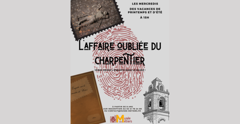 Pendant les vacances, le Musée des Métiers vous propose de partager un moment en famille, chaque mercredi. Lors de ces "Mercredis familles", venez retrouver qui a tué Victor, le charpentier de l’église de Saint-Laurent-de-la-Plaine en 1900, en retrouvant des indices laissés dans le musée, avec le cluedo "L'affaire oubliée du charpentier".